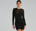 It will be your moment to sparkle in this sultry and stunning mini dress. It features a sheer mesh bodice with a crew neckline and long sleeves. a mini-length lining with a sweetheart outline. all-over ruching. and a short. curve-hugging silhouette. The sheer mesh fabric has mini heat stone embellishments for a glamorous vibe. Complete the look with lace-up heels.