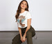 Keep it chic and edgy with a graphic tee that says it all! The top features a crew neckline. short sleeves. a graphic that reads: "Custom Motorcycles". an image of a motorcycle with eagle wings. slashed detailing. and a cropped hem. The top is composed of a cotton knit fabric that offers a form hugging fit with a moderate stretch. Complete look with cargo pants.