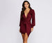 Create a natural attraction with a simply flattering look! This mini dress features a v neckline. long sleeves that puff at the wrist with a thick band. and a front knot detailing at the center of the bodice. Skirt meets bodice with a wrap design and an asymmetrical hemline that meets mid thigh. Dress is composed of a smooth knit material with a sheen reflection and moderate stretch.