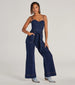 A sleeveless denim jumpsuit features a sweetheart neckline. a trendy tie waist belt. and a flared leg silhouette. Style with pointed-toe booties for a concert.