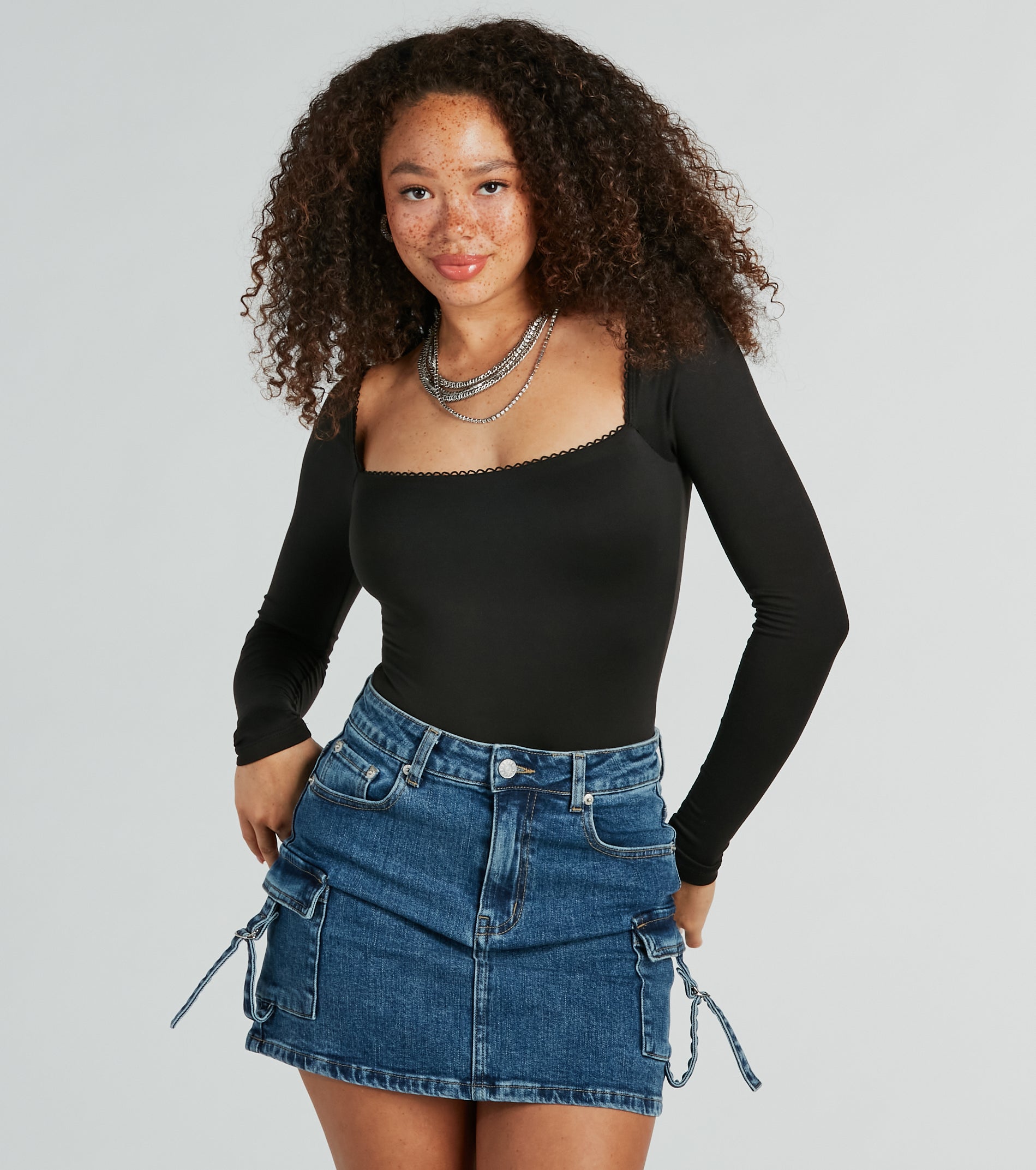 This elevated basic long sleeve bodysuit will become a new fave and staple in your closet. Designed with a stretchy double-lined brushed knit fabric. this bodysuit features a square neckline with a cute dainty scalloped trim. long fitted sleeves. a cheeky bottom with a snap button closure. and a form-hugging fit. Style with straight-leg jeans and strappy mules.