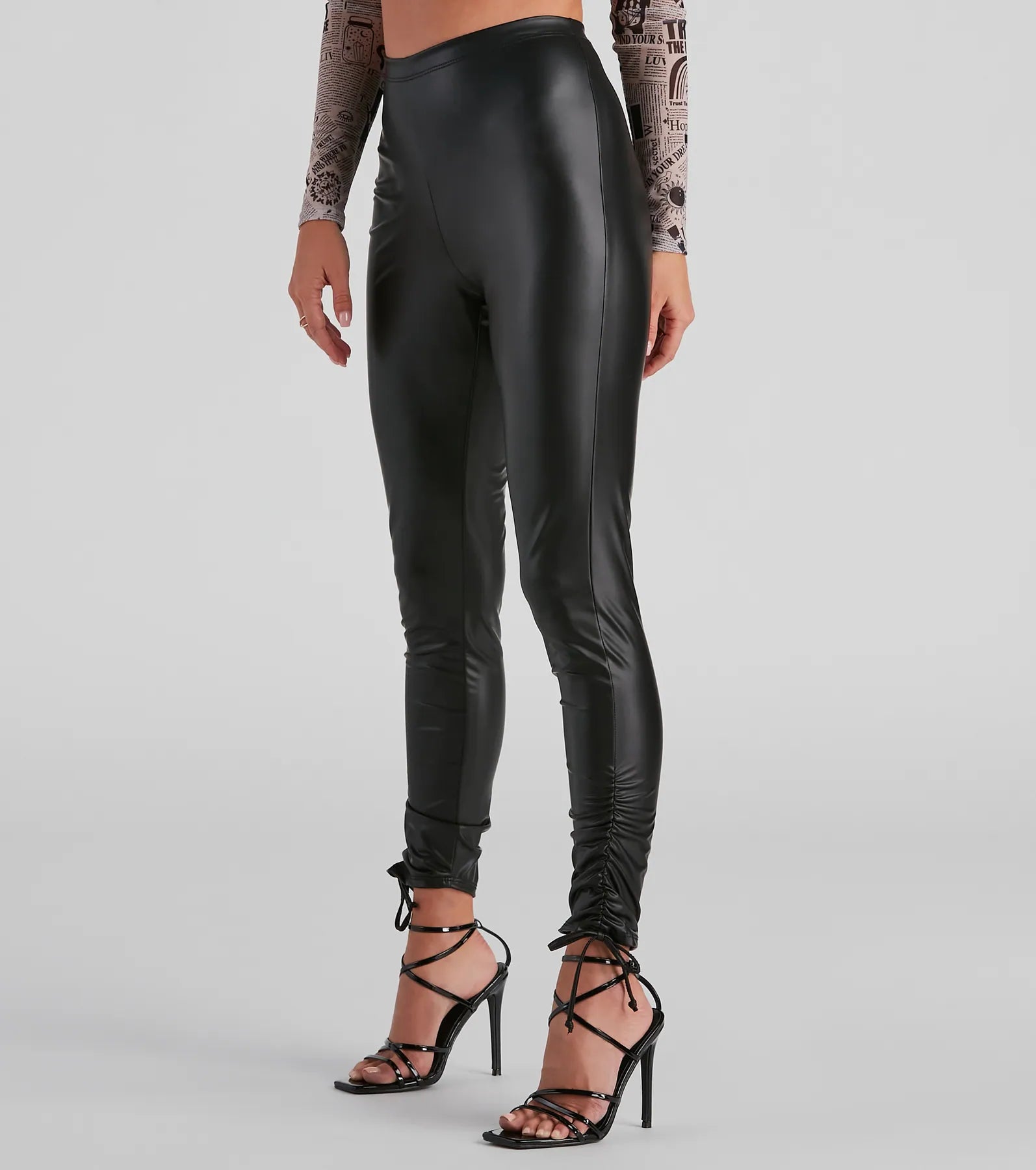 These faux leather leggings are next-level chic! They feature a sleek. high-rise waist. skinny-leg design. and ruched ankle seams for a trendy look. Complete your outfit in a mesh crop top for a night out.