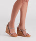 Step out to impress in these luxe cork wedges perfect for sunset wine tastings to dinner out with the girls! They feature an almond toe. rhinestone embellished toe and ankle strap. and a cork platform sole. Complete the look with sparkly rhinestone earrings.