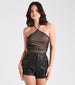 This mesh halter bodysuit will inspire your next outfit slay! It features a sleeveless halter neckline. dual bungee spaghetti straps. side ruched seams. a sheer mesh thong bottom with dual snap-button closures. and a contrast knit lining. Complete the look in a sleek mini skirt for a night out.
