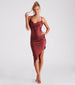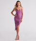 Showcase an alluring vibe for a night out on the town in this sleek sleeveless midi dress! It features a trendy cowl neckline. spaghetti straps. shirring at the waist. an asymmetric midi-length hem creating a chic side slit. and a bodycon silhouette that will hug your curves. The smooth knit fabric offers a moderate stretch. Style with clear heels.