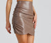 You'll be ready for a night-out in this sleek and stunning ruched mini skirt. It features a high-rise waist. a faux wrap design. and a short. curve-hugging silhouette. The skirt is composed of a smooth faux leather fabric. Complete the look with a chic corset top and heels.