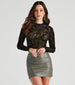 Keep your night out style on-trend with this alluring completely sheer mesh crop top! It features a mock neckline. long fitted sleeves. a cropped. form-hugging fit. and an all-over eye-catching flocked velvet swirl pattern. Style over a lace bralette with a faux leather mini skirt.