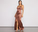Keep it sleek in our Nikita dress that brings the elegance to your formal evening. She features a plunging sleeveless wrap V-neckline. padded cups that eliminate the need for a bra. sleek spaghetti straps. a ruched silhouette that enhances curves. and a floor-length silhouette with a dramatic asymmetrical high slit. Complete your look with rhinestone earrings and clear heels.Â