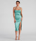 Nikki brings the perfect dose of sleek and bold style to your formal event! She features a sleeveless. square neck. spaghetti straps. and a bodice with flexible boning inserts for a structured fit. Her form-fitting silhouette flaunts your femme figure with a sultry front slit along a midi-length hem. She's composed of a stretch-satin luxe fabric with lining. Complete the look in glitzy heels and a clutch.