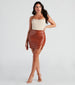 Picture perfect and no filter needed. flaunt your best self in this sultry faux leather mini skirt featuring a sleek high-rise waist. back zipper closure. and a bodycon silhouette and sultry front slit. Style this skirt for a party completing your look with a crop top and heels.