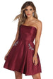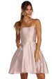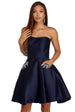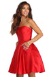 Claim the throne as you reign the night in luxe rhinestones! Our Noelle dress features a sleeveless bodice. a sweetheart bust with a built in no slip strip. padded cups. built in boning for structure and princess seams. Her slim fit bodice leads to a flaring multi layered party length skirt with hidden side pockets accented with rhinestones and gemstones. Dress is composed of a satin fabric that offers a form hugging fit with minimal stretch. Includes a hidden back zipper closure and petticoat