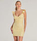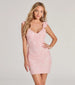 This sequin mini dress exudes sparkle making it perfect for school dances or birthdays. The bodycon dress features a V-neckline with padded bra cups. ruffle trim adjustable spaghetti straps. and a cutout back.