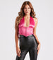Once you catch sight of this satin corset top. you'll be falling for it over and over again! The sleeveless top features a halter plunge V-neckline with tie-back closure. low-cut sides with lace-up packets. hidden front hook and eye closures. flexible boning inserts. a cropped hem. and a partial open-back. Style with sleek skinny pants to complete the look!