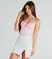 Get ready to have some playful fun in this satin floral corset top! Featuring a scoop neckline with a keyhole tie and adjustable spaghetti straps. it offers comfortable support with an underwire bust and flexible boning. The cropped hem and multiple back hook and eye fasteners make for a flirty and customizable fit. Complete the look in high-rise jeans for a day date or Galentine's brunch!
