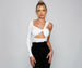 Stun with a bodysuit that is a true one of a kind! The bodysuit features a one-shoulder neckline with a fitted long sleeve. a twist front accent at the bodice. a cutout at the midriff. and a thong bottom with dual snap button closure. The bodysuit is composed of a brushed knit fabric that offers a form hugging fit with a moderate stretch. Complete look with mom jeans.
