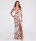Packing this gorgeous tropical print maxi dress in your carry-on is a must for your vacay getaway! It features a sleeveless V-neckline with an O-ring accent at the bust. a sultry waist cutout at the front. adjustable spaghetti straps. a fitted. flowy. floor-length hem. and a thigh-high front slit. The smooth knit fabric showcases a tropical palm leaf print. Style with cute wedges.