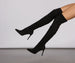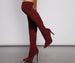 Make a sleek impression with over the knee boots that slay! The boots feature an over the knee fit. a pointed toe. and a sleek stiletto heel. The boots are composed of a faux suede material. Complete your look with a ribbed mini dress.