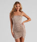 Enchant them all in your love for all things paisley! This square neck mini dress features a sleeveless bodice. spaghetti straps. a bodycon silhouette. and a front ruched seam on stretchy knit fabric. Complete the look in espadrille wedges.