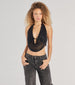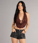 A cropped rhinestone halter top that'll inspire your next going-out look! It features a sultry plunge cowl neckline and a partially open back that turns heads. Pair with jeans.