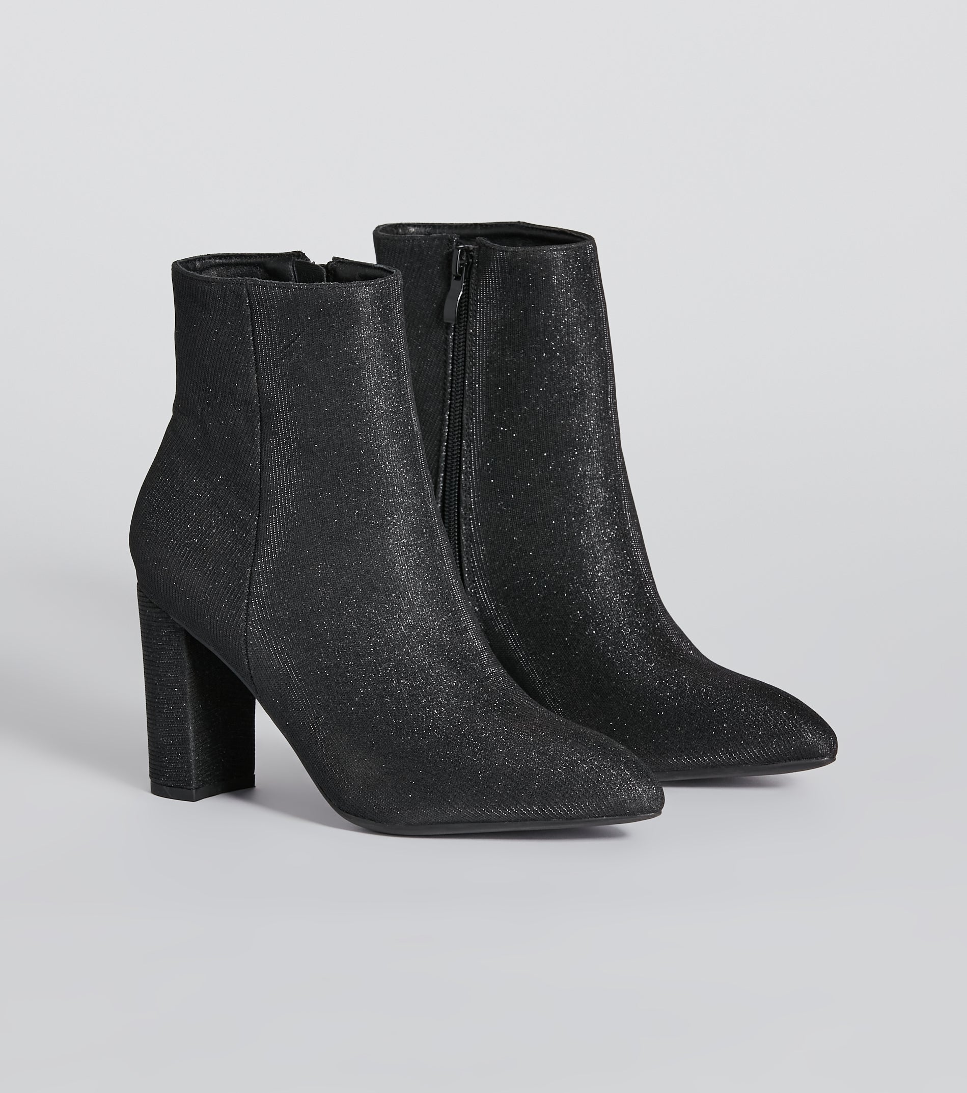 Get the party popping in these glitter mesh booties for the ultimate sparkle! They feature a pointed toe. a block heel. inner zipper closure. and an ankle-length fit. Complete the look in a sultry jumpsuit for a holiday party!
