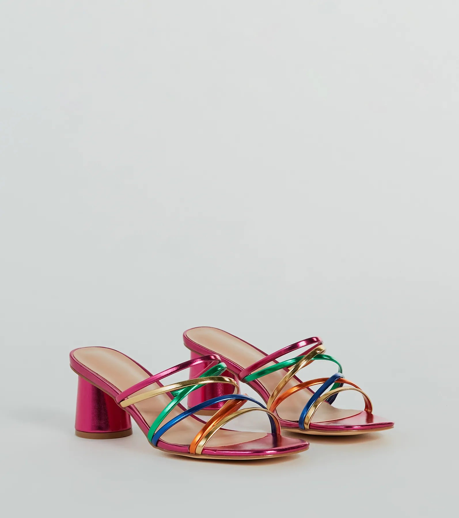 Get the party started with these strappy metallic mules that bring the trendy allure! Designed with a fab metallic faux leather material. they feature an open square-shaped toe. a multi-colored asymmetric strappy design across the foot. and a block heel. The open back offers effortless on-and-off styling. Pair with statement earrings for an iconic look.