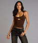 Simple with a twist. This ribbed knit crop top keeps it sleek with spaghetti straps and a body-hugging fit. while a front cutout adds a flirty allure to your favorite looks.