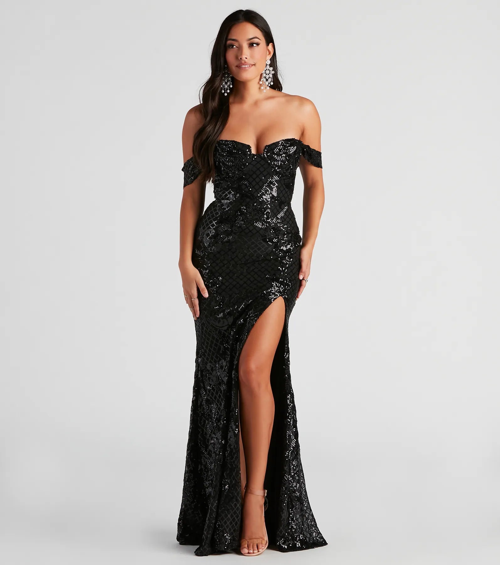 Bring the regal vibes to your formal night-out look in the gorgeous Penelope mermaid dress! She features a flattering off-the-shoulder sweetheart neckline with short fitted sleeves. a structured and padded bust. a high waist seam. and a floor-length mermaid silhouette with a chic high side slit. The lined mesh fabric features sequin embroidery in a stunning criss-cross and scroll pattern. Complete the look with chandelier earrings.