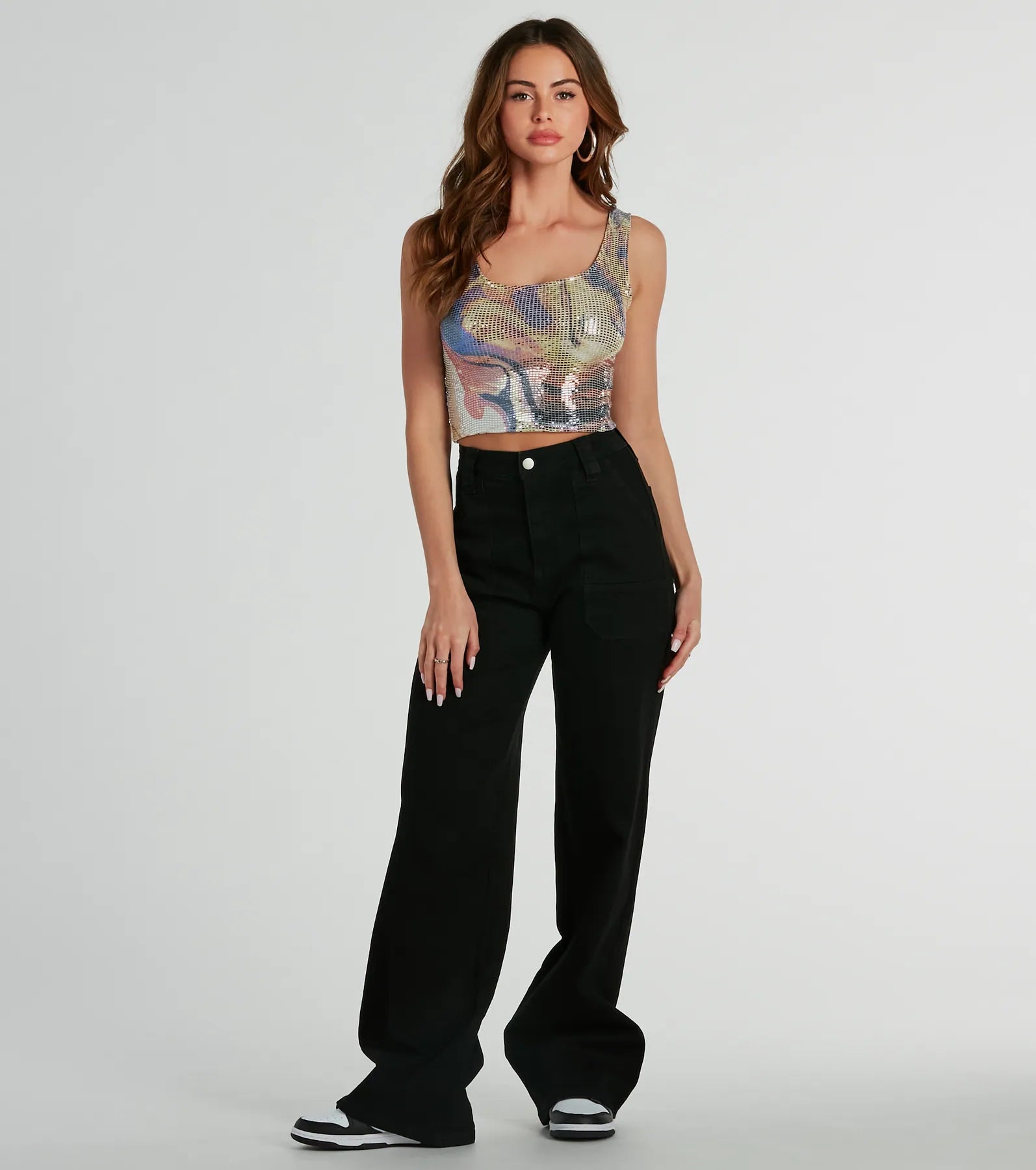 The perfect blend of dazzle and artsy. this sequin swirl print tank top elevates your going-out look! Designed in a sleeveless silhouette. a flattering square neckline. and a fitted crop hem to flaunt your figure. Complete the look in flare pants for a party!