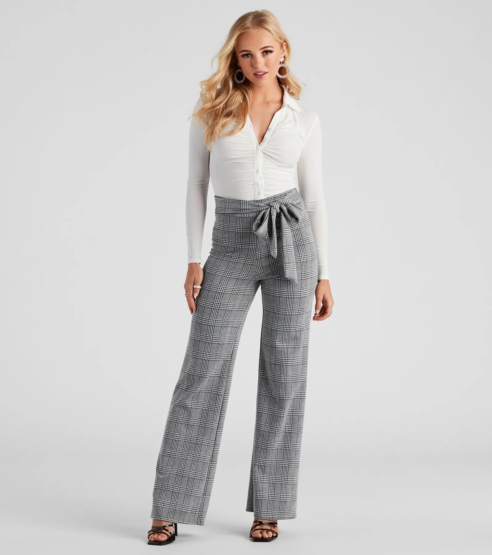 Show off the perfect 'fit in these chic plaid trouser pants! They feature a high-rise waist with a cute tie-front design. a wide-leg silhouette. and an on-trend plaid pattern. The knit fabric offers a moderate stretch. Style with a basic bodysuit and strappy mules.