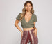 Keep it cute in this basic crop top. The top features a plunging surplice V-neckline. short sleeves with elastic cuff. and a cropped hem. The top is composed of a gauze-like linen fabric that offers a relaxed fit with slight stretch. Complete your look with a pair of high waist jeans and statement hoop earrings.