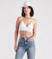 This crop top is perfectly pretty for festivals and concerts! This ribbed knit crop top features a sleeveless V-neckline. adjustable spaghetti straps. back hook-eye closures. and a faux pearl fringe trim along the hem. Complete the look in trendy printed flare pants.