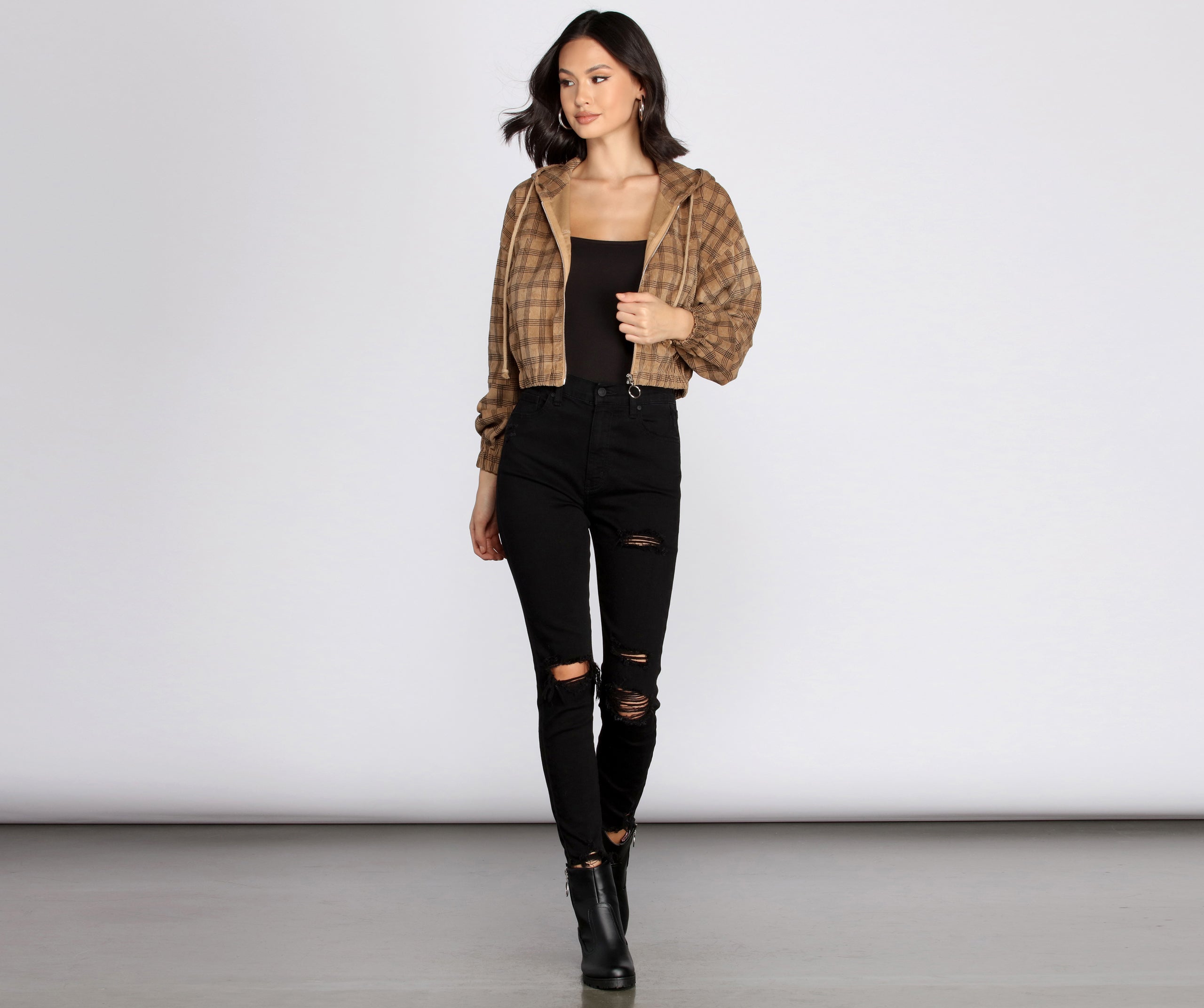 Add a casual cute vibe to your look with this plaid corduroy bomber. perf for everyday wear!