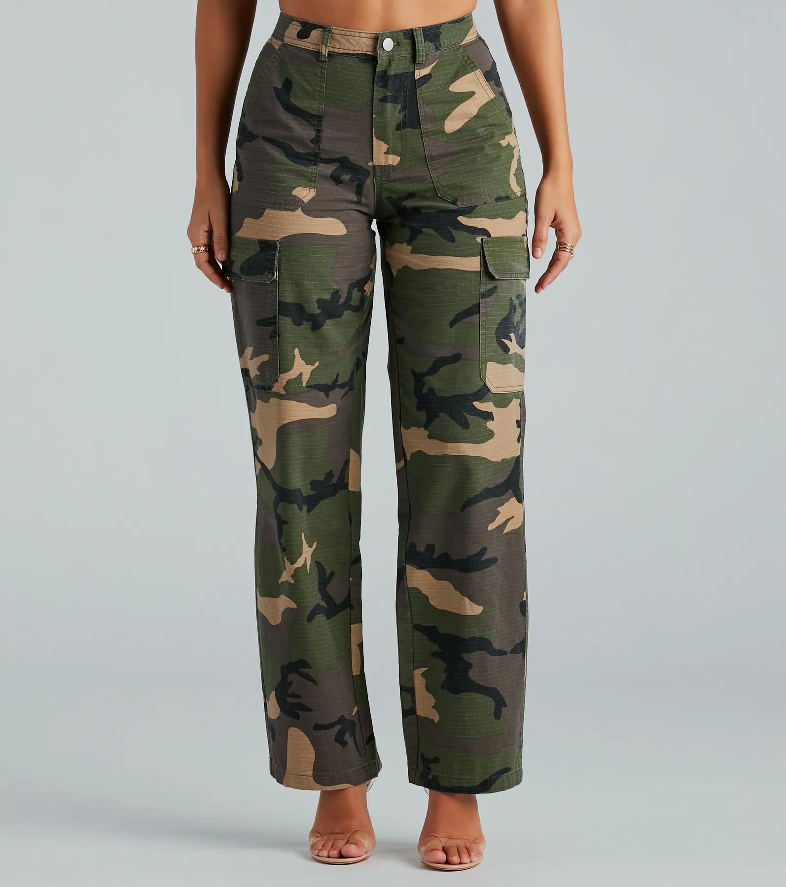 These camouflage pants play fair everywhere you wear them! Featuring a high-rise waist. a flattering wide-leg silhouette. cargo-style flap pockets. and a trendy camouflage print on woven fabric. Style the cargo pants with a basic bodysuit top and mules for a day out!