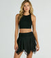 Play and frolic through the fields in this lovely floral embroidered mesh skort! This high-rise waist skort features a skater silhouette and hanky mini-length hem. made with delicate floral embroidered mesh fabric and a comfortable knit lining. Complete the look in a crop top and sandals!