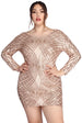 Slay in sequins as you bring the glitz in our Elysse dress! She features a high round neckline. fitted long sleeves and a fun mini length silhouette. She is composed of a lined mesh fabric that is adorned with dazzling sequins set in a geometric pattern. Dress offers a curve flattering fit with plenty of stretch. Includes a back zipper closure.