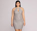 You are a stunner doll! And this is the dress to prove it. Featuring a high halter style neckline. a sleeveless bodice. and a keyhole cut out at the breast. This mini dress is fully lined with a smooth inner material. Dress has a long zipper from lower back to neck. and is composed of a knit fabric that offers a form fitting silhouette with maximum stretch. The pattern of the fabric is adorned with a vertical stitching and all over gemstones. The hem of the dress hits mid thigh.
