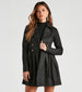 Layer on this adorable belted trench for a poised and polished look! It features a lapel collar. long sleeves. a high waist with double button detailing. a tie-front belt. and a flared-out hem. Style this trench with sleek faux leather booties.