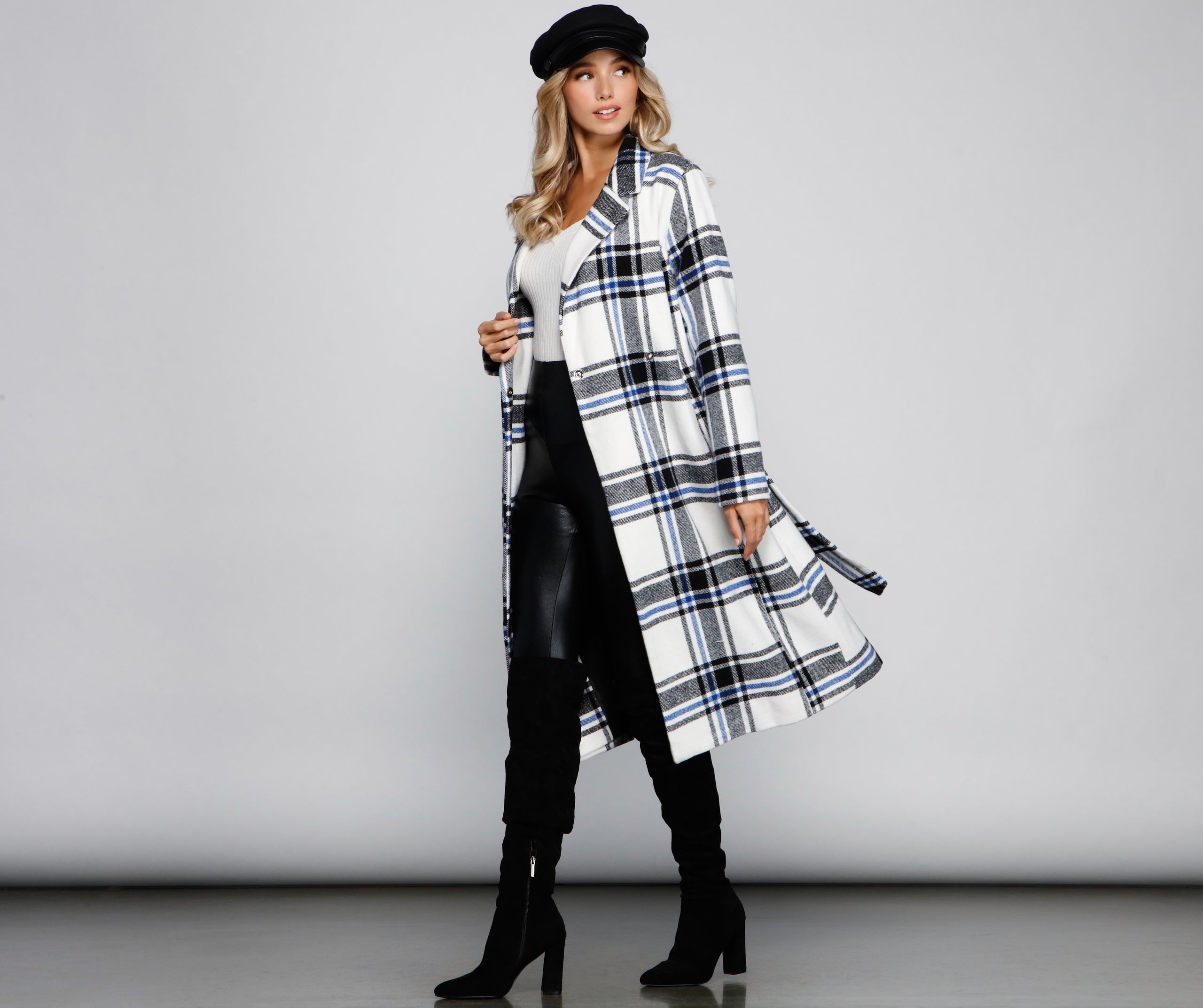Keep it très chic with a trench coat to layer over your sophisticated outfits for workwear or semi-formal outings! The coat features a plaid print. a collared neckline. long sleeves. a multi snap button front closure. an adjustable tie-waist belt with belt loops. lined hidden side pockets. a tapered long length. and a high center slit at the back. The coat is composed of a lined wool-like knit fabric that offers a relaxed fit with minimal stretch. Complete look with a bustier and skinny dress pants.