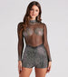 Inspired by your favorite pop stars. this rhinestone romper will show everyone you're the real star of the show! The romper features fitted long sleeves. a mock neck. a sheer mesh bocie with rhinestone embellishments. and a short. cheeky fit. The romper has a partial lining along the rhinestone-embellished shorts. Style with clear strap block heels to complete the look!