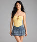 You'll draw everyone will this posh and pretty ponte crop top! Designed with a sleek strapless neckline and front bows with cutouts. this top will turn heads.