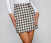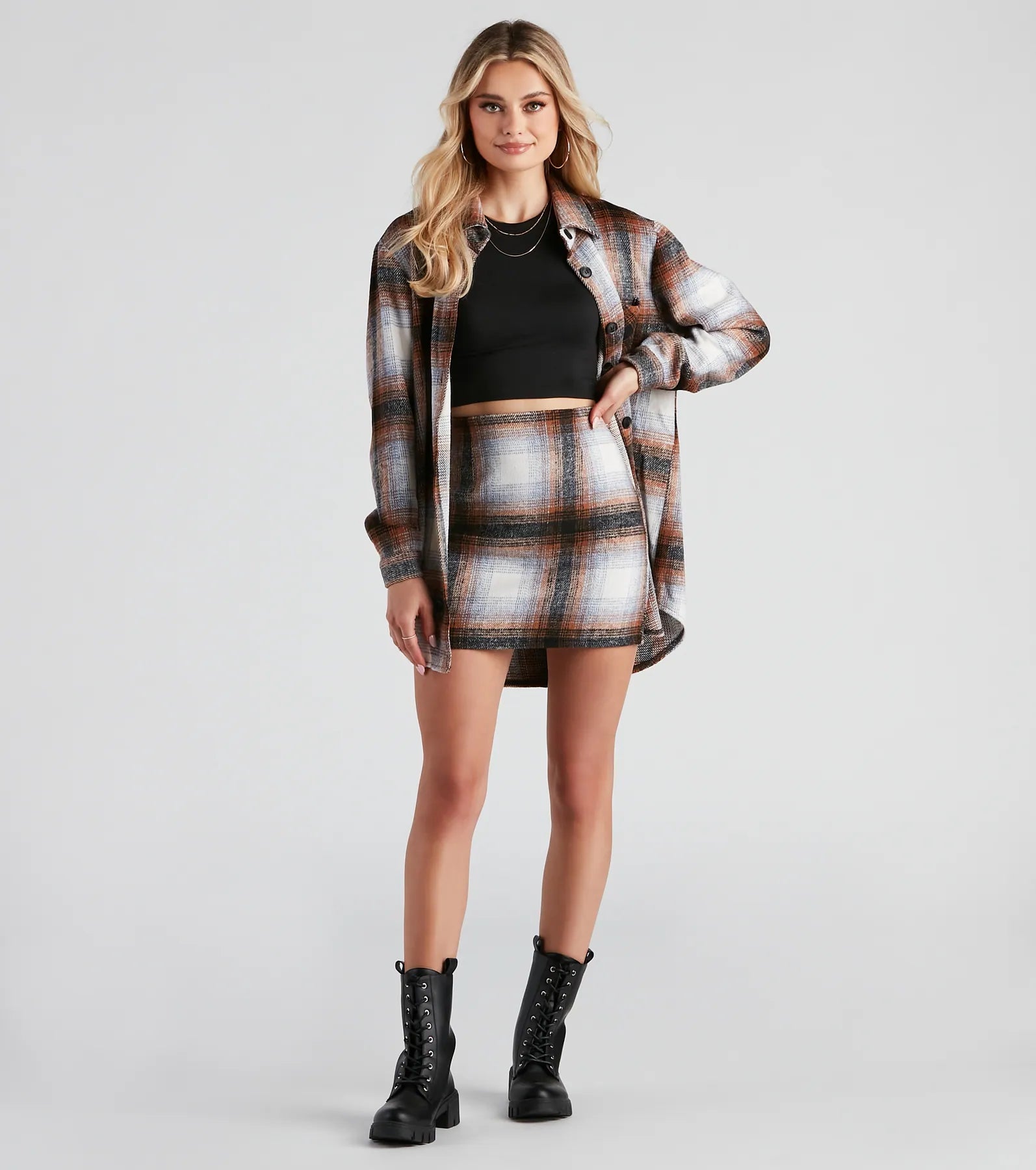 Keep it preppy and cute with a skirt that is perf for grabbing your PSL in! The skirt features a plaid print. a high-rise waist. a mini-length silhouette. and a back zipper closure. The skirt is composed of a wool-like knit fabric that offers a form-hugging fit with minimal stretch. Complete look with matching the shacket.Â