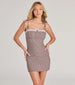 This plaid mini dress features a lace rose trim square neckline. spaghetti strap ties. and a flattering bodycon silhouette perfect for casual plans.