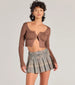 This preppy plaid woven skort features a high-rise belted waist and a mini-length pleated A-line overlay with fitted knit shorts for coverage. Style with a cropped cardigan and sneakers.