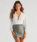 Illuminate at your next party with the prettiest sparkle in this airy mesh bodysuit! It features a deep V-neckline. long bishop sleeves. ruching. and a thong-knit bottom. The sheer mesh fabric features all-over iridescent rhinestones for a glamorous look. Style with faux leather shorts and clear heels.