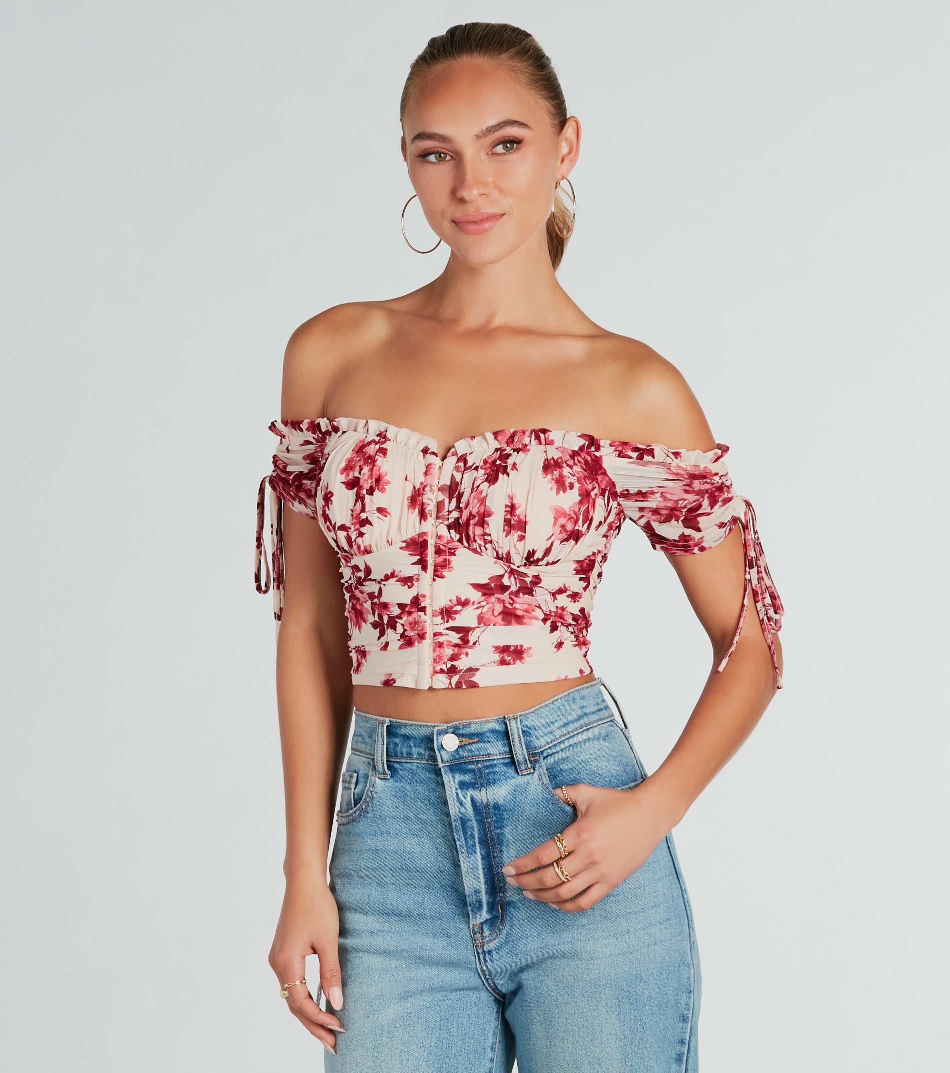 Effortlessly pretty will be your vibe in this floral corset top! Designed with an all-over blooming floral print pattern. the crop top features an off-the-shoulder neckline with the cutest ruffled trim. short fitted sleeves with tie strap accents. a built-in padded bust. complete hook and eye front closures. all-over ruching. and a form-hugging fit. The airy sheer mesh fabric includes a knit lining. Style with light-wash jeans and clear-heeled mules.