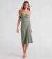 This crepe midi dress has the pretty deets you're looking for! The dress features a sleeveless square neck. spaghetti straps. an open lace-up back with tie closure. a ruched bust. and a bodycon silhouette. Complete the look in chic flat sandals.