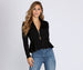 Get preppy. feel pretty! This jacket features a plunging collared neckline. long sleeves. front zipper detail. and a peplum trim hem that is mid length. Blazer is composed of a crepe material that offers moderate stretch and a form fit.