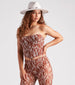 If your instincts lead to this zebra print bustier...it belongs in your cart! Featuring a strapless and structured bodice with flexible boning. a pointed crop hem. and a back zipper and hook-eye closure on a lined mesh fabric. Complete the look with the matching flare pants.