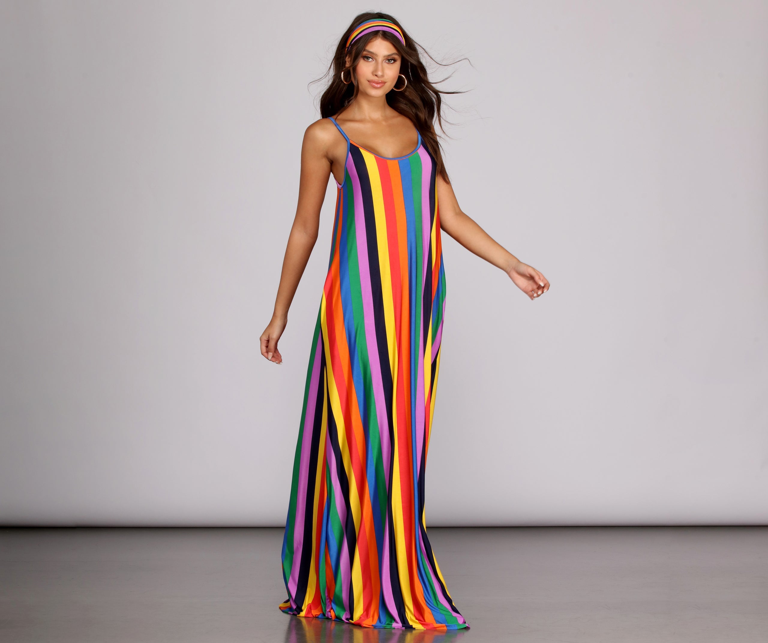 You love color. so embrace the rainbow! All eyes will be on you in this vibrantly chic maxi dress. which features a multi-hued stripe pattern. spaghetti straps. scoop neck. pockets at either hip. and plenty of stretch. Don't forget to pair it with the matching head wrap!
