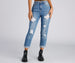 Raise the bar with jeans that take your look to the next level! The jeans feature a high-rise waist. a trendy mom leg. moderate destruction. a cropped cuffed hem. The jeans are composed of a cotton medium denim fabric that offers a relaxed fit with minimal stretch. Complete look with a graphic tee and combat boots.Â